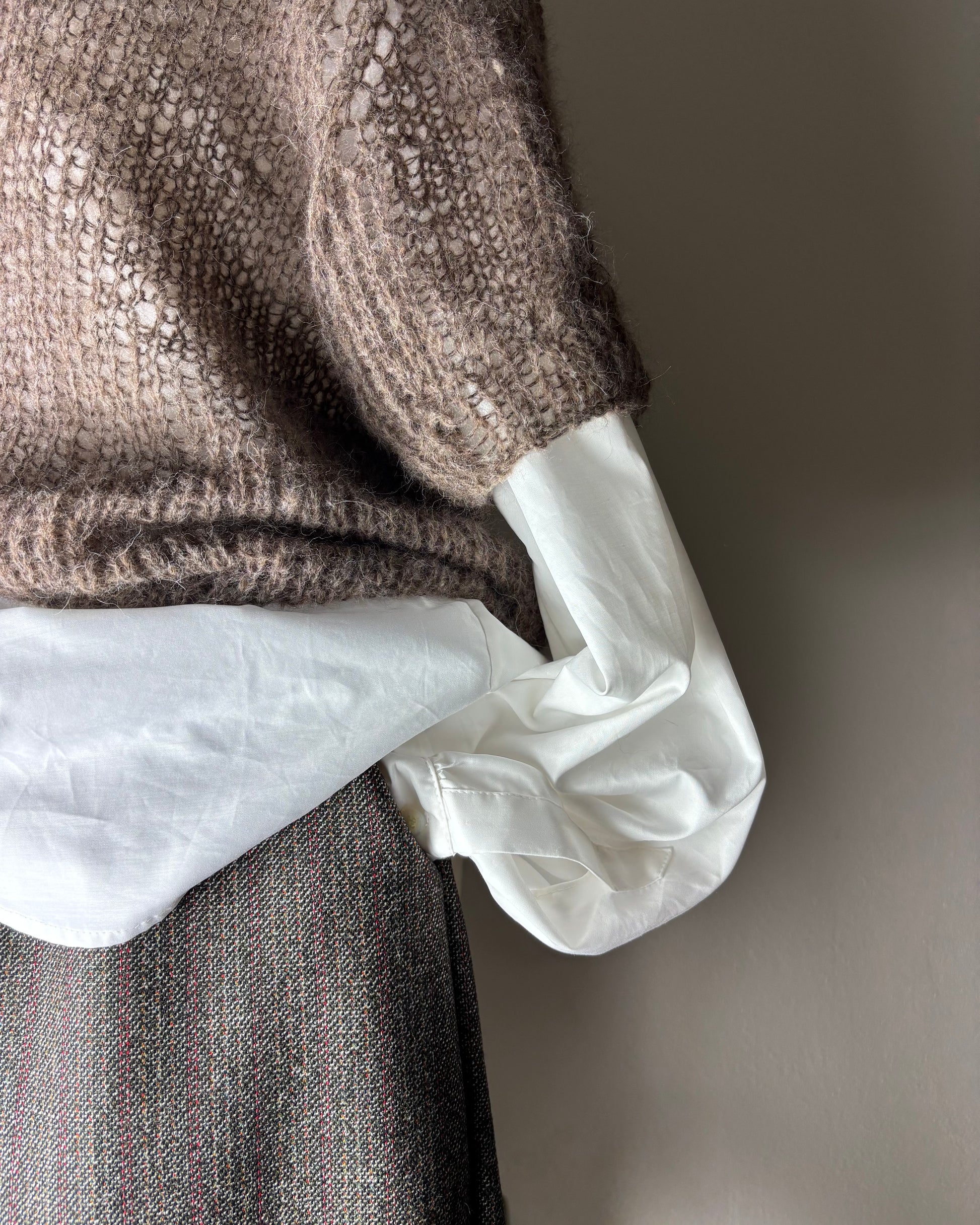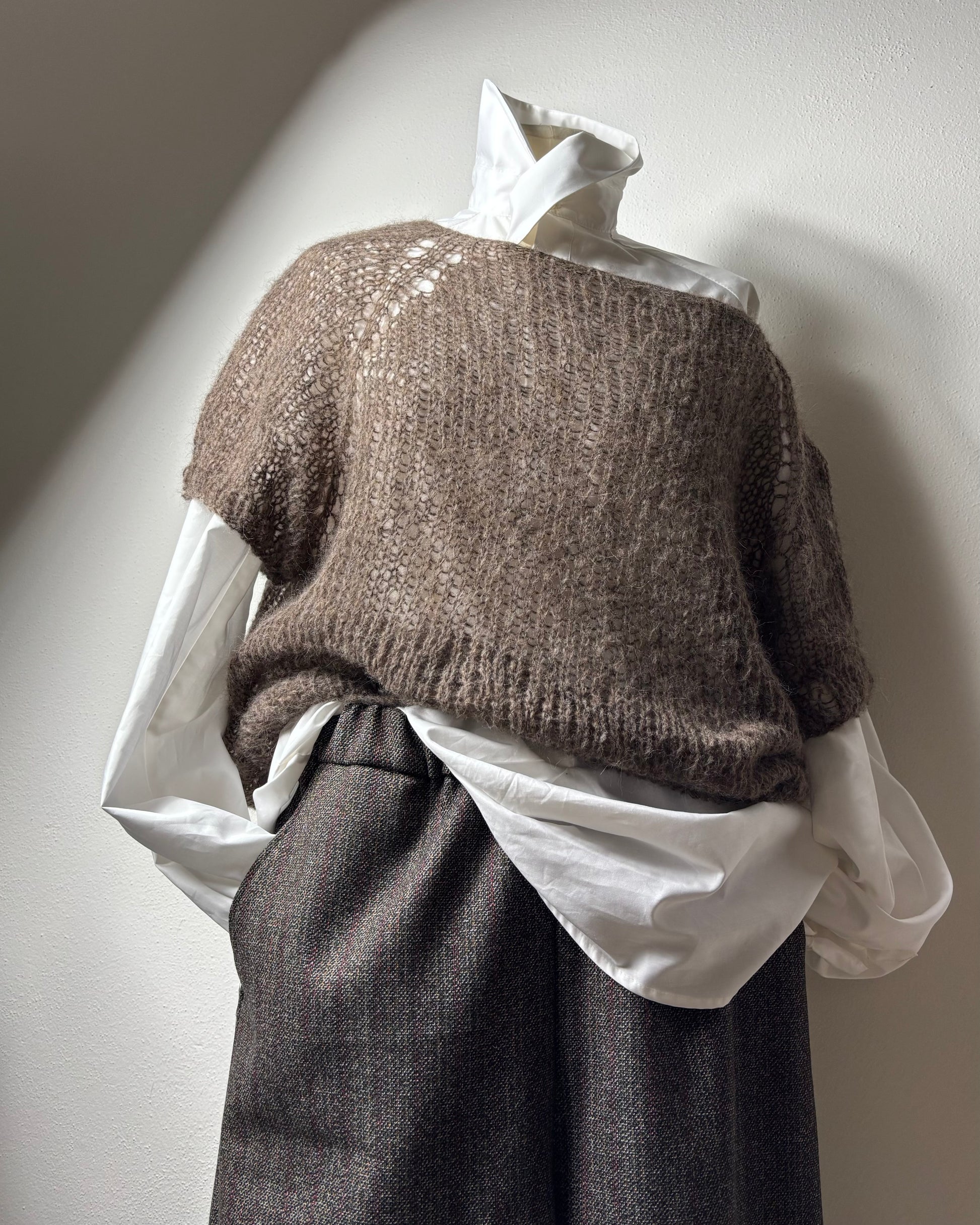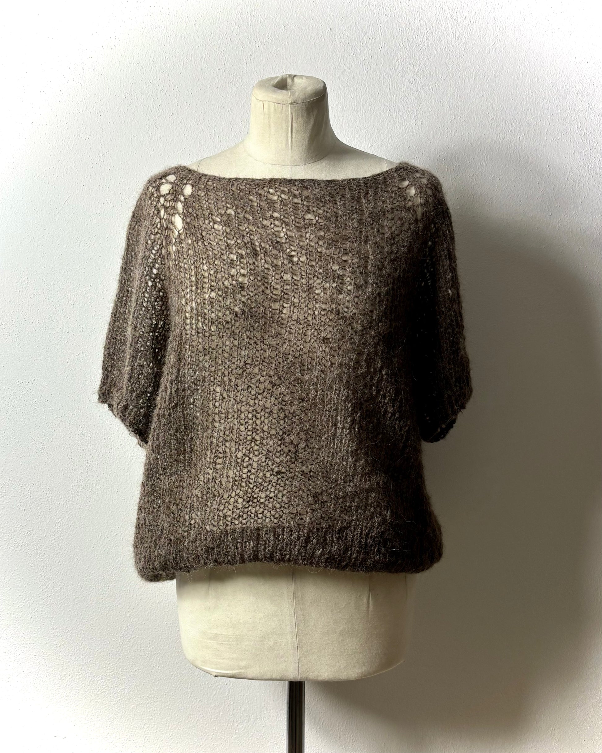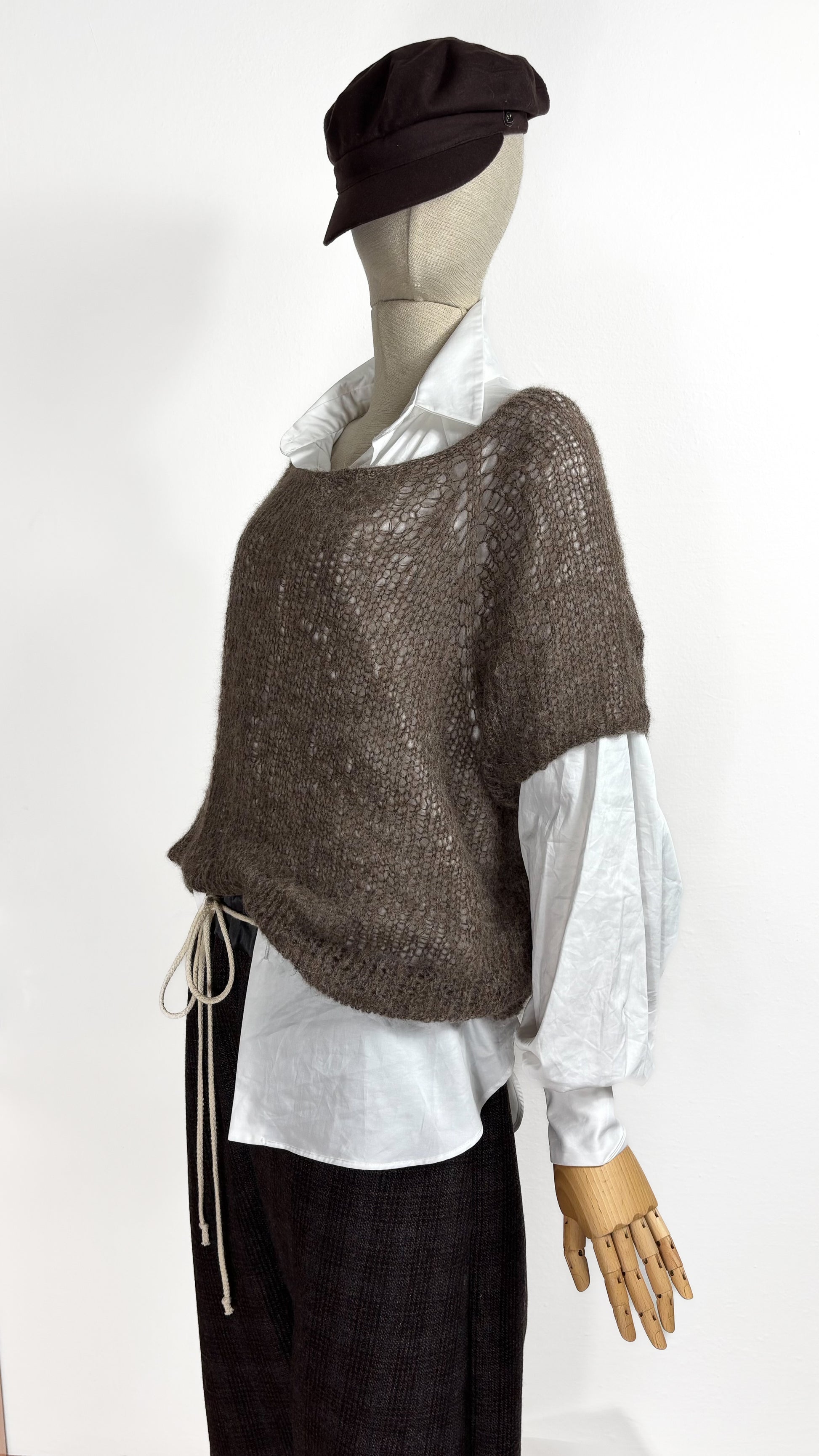 Maglia artigianale realizzata interamente ai ferri in un filato pregiato di alpaca e lana, con una piccola percentuale di poliammide per stabilizzare e valorizzare la leggerezza delle fibre naturali.