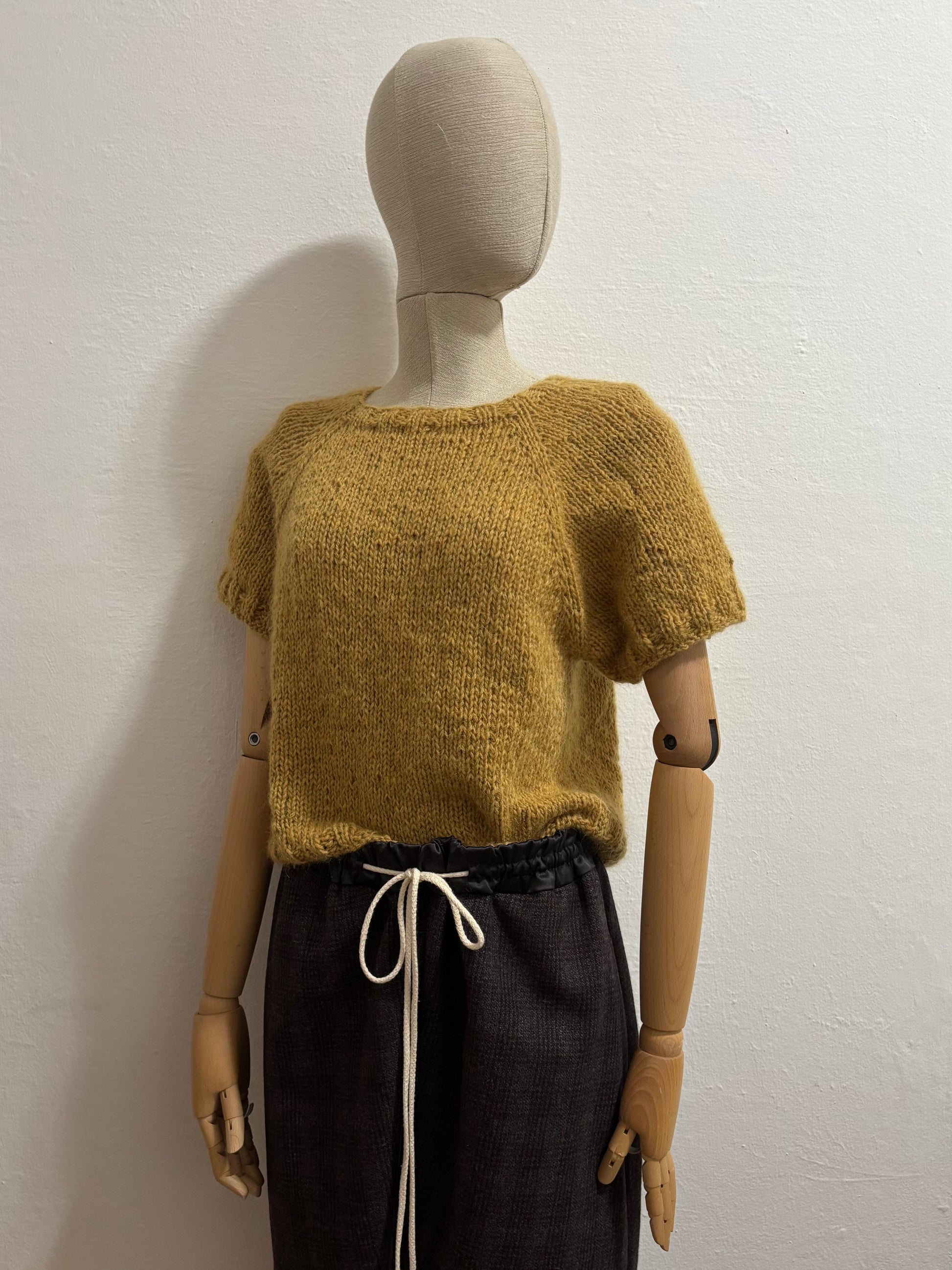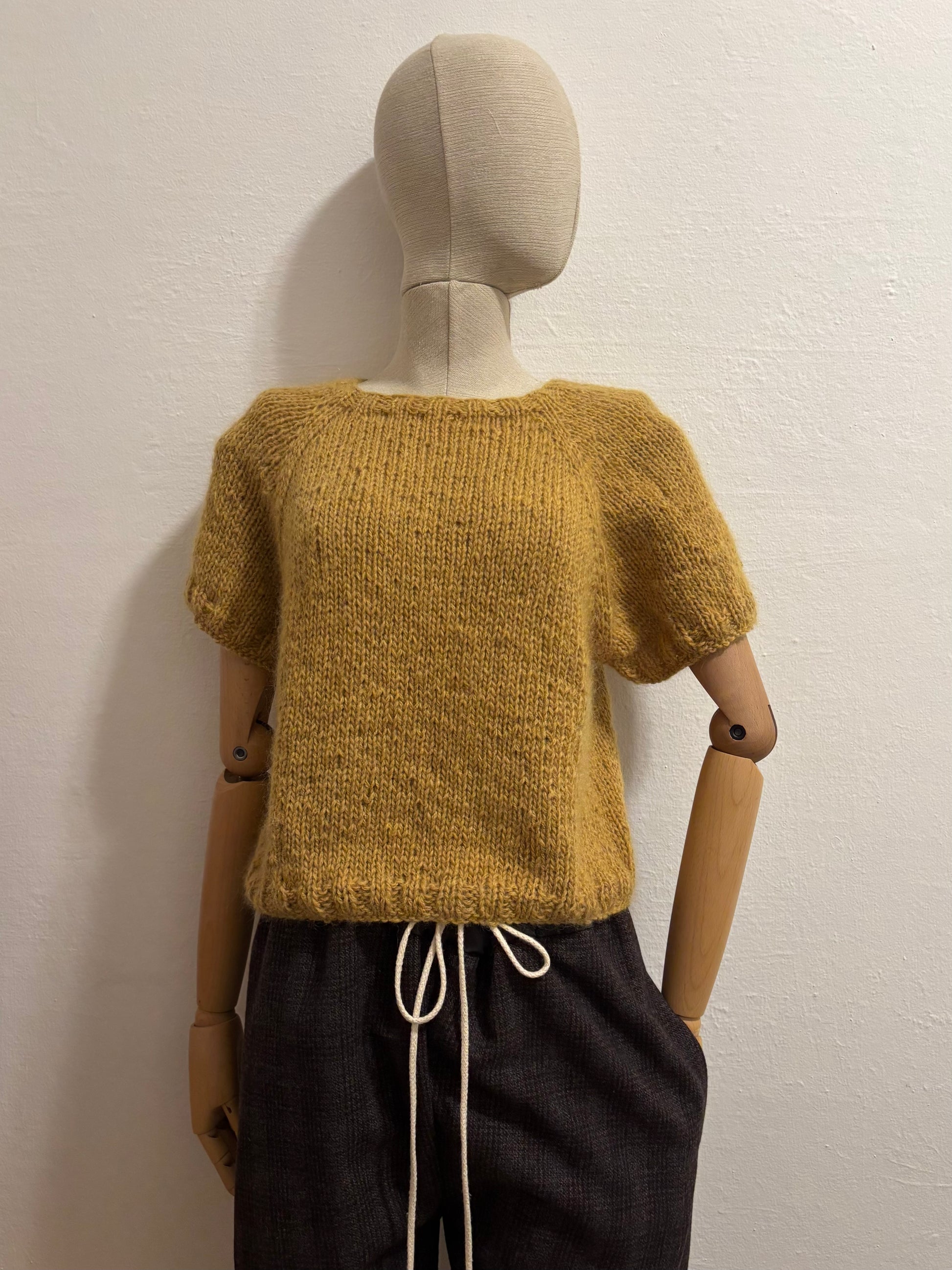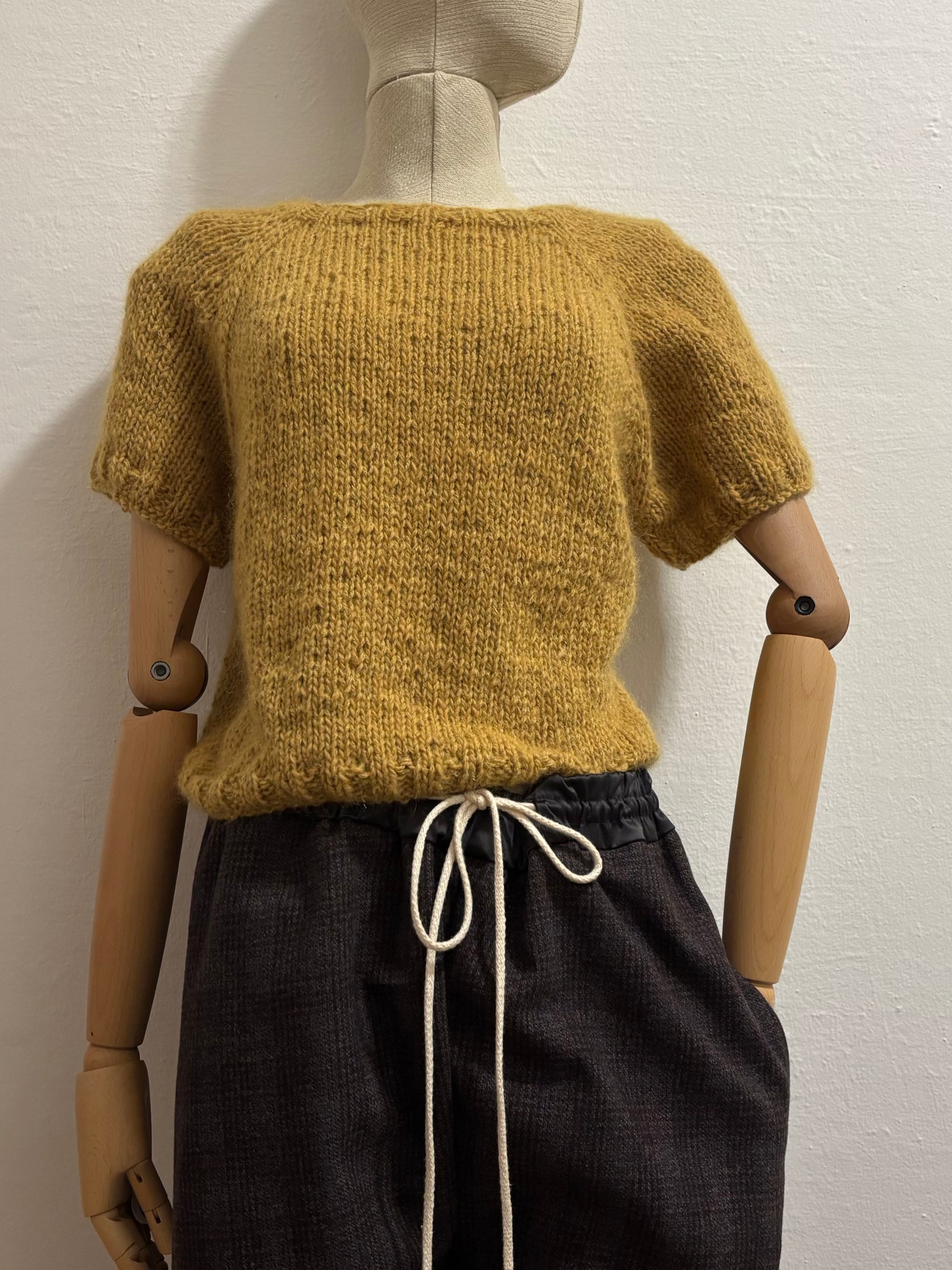 Maglia artigianale realizzata ai ferri unendo due filati pregiati di alpaca e lana, con una piccola percentuale di poliammide per stabilizzare la fibra e accompagnare il tempo.