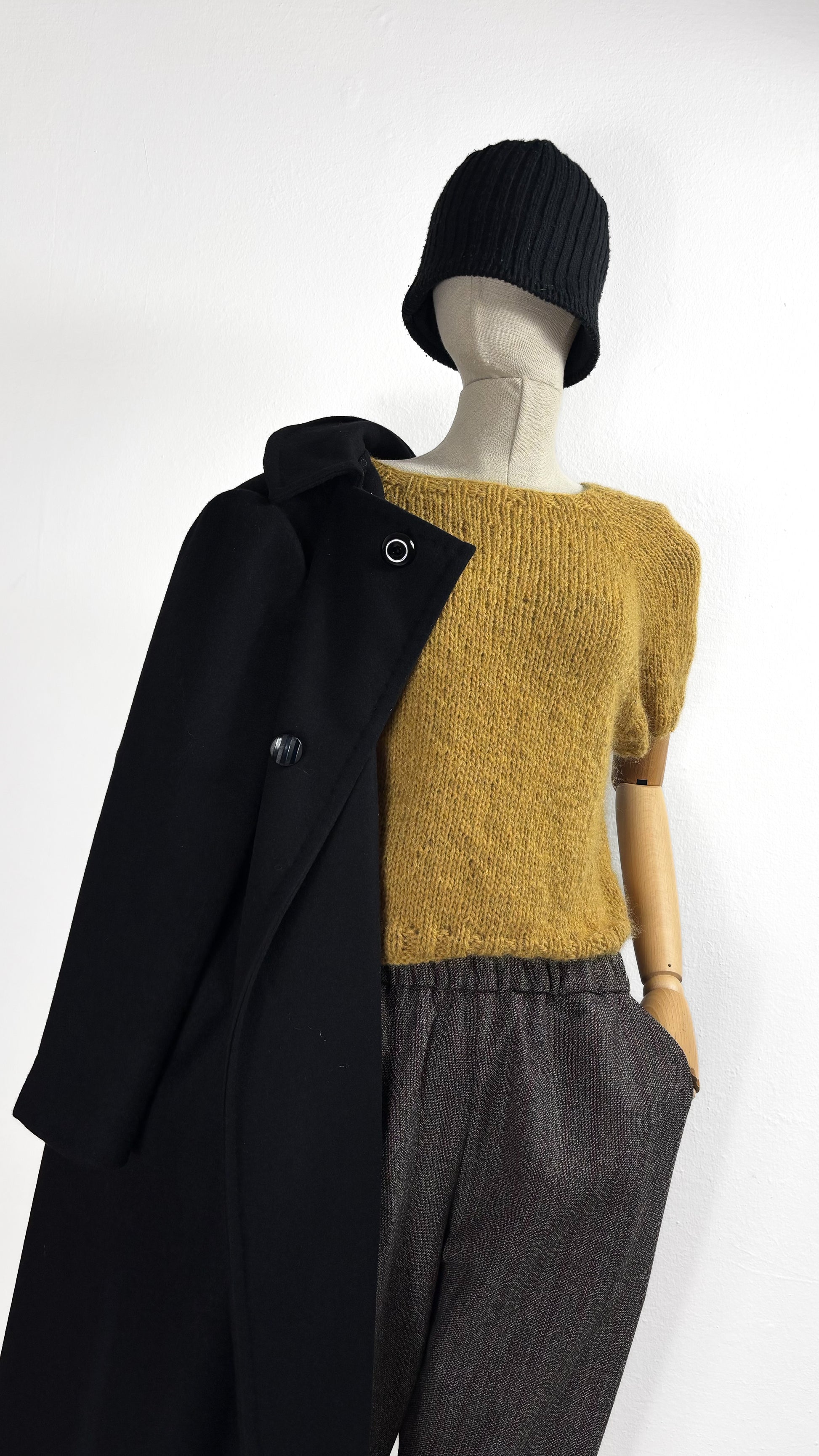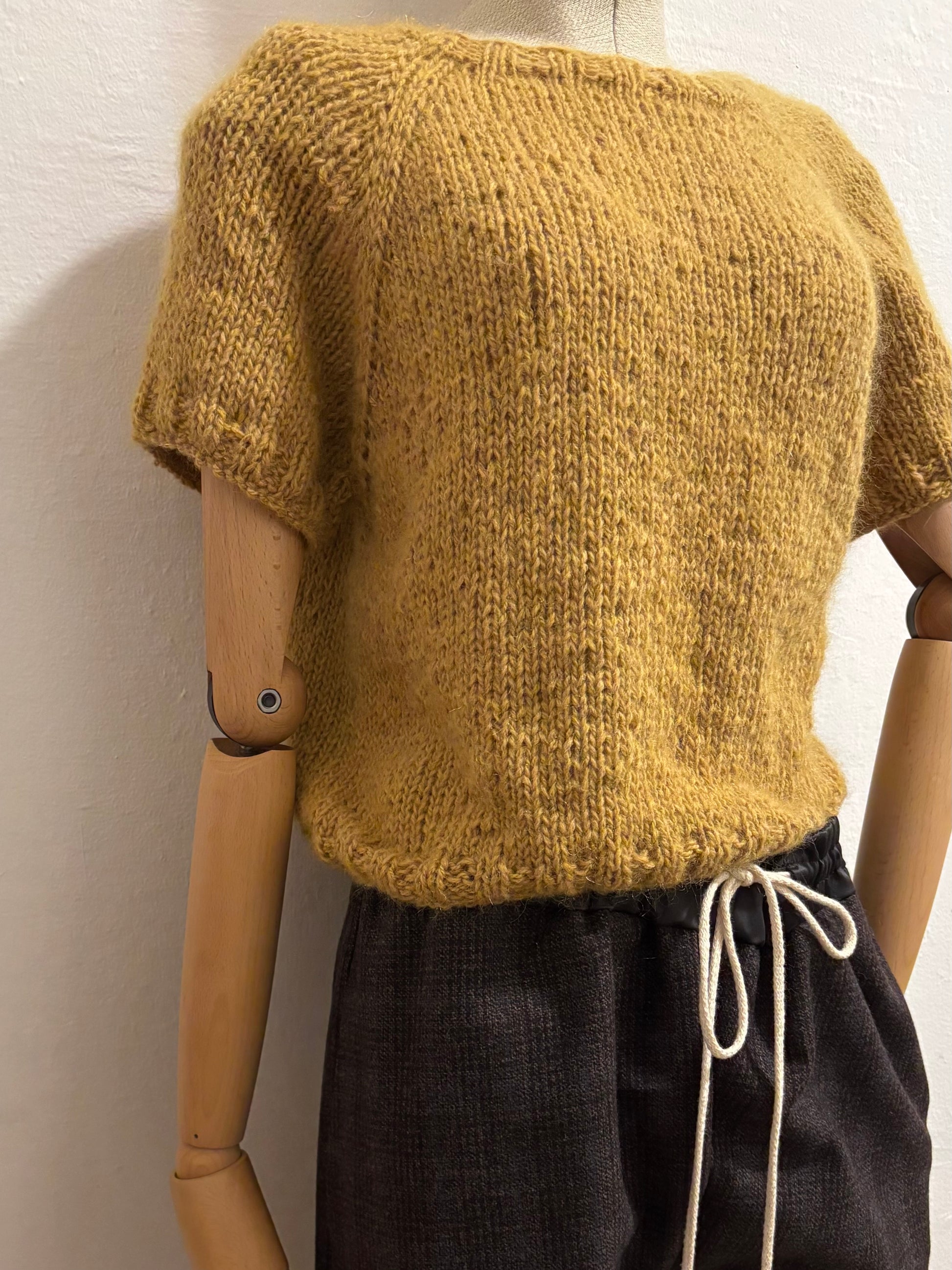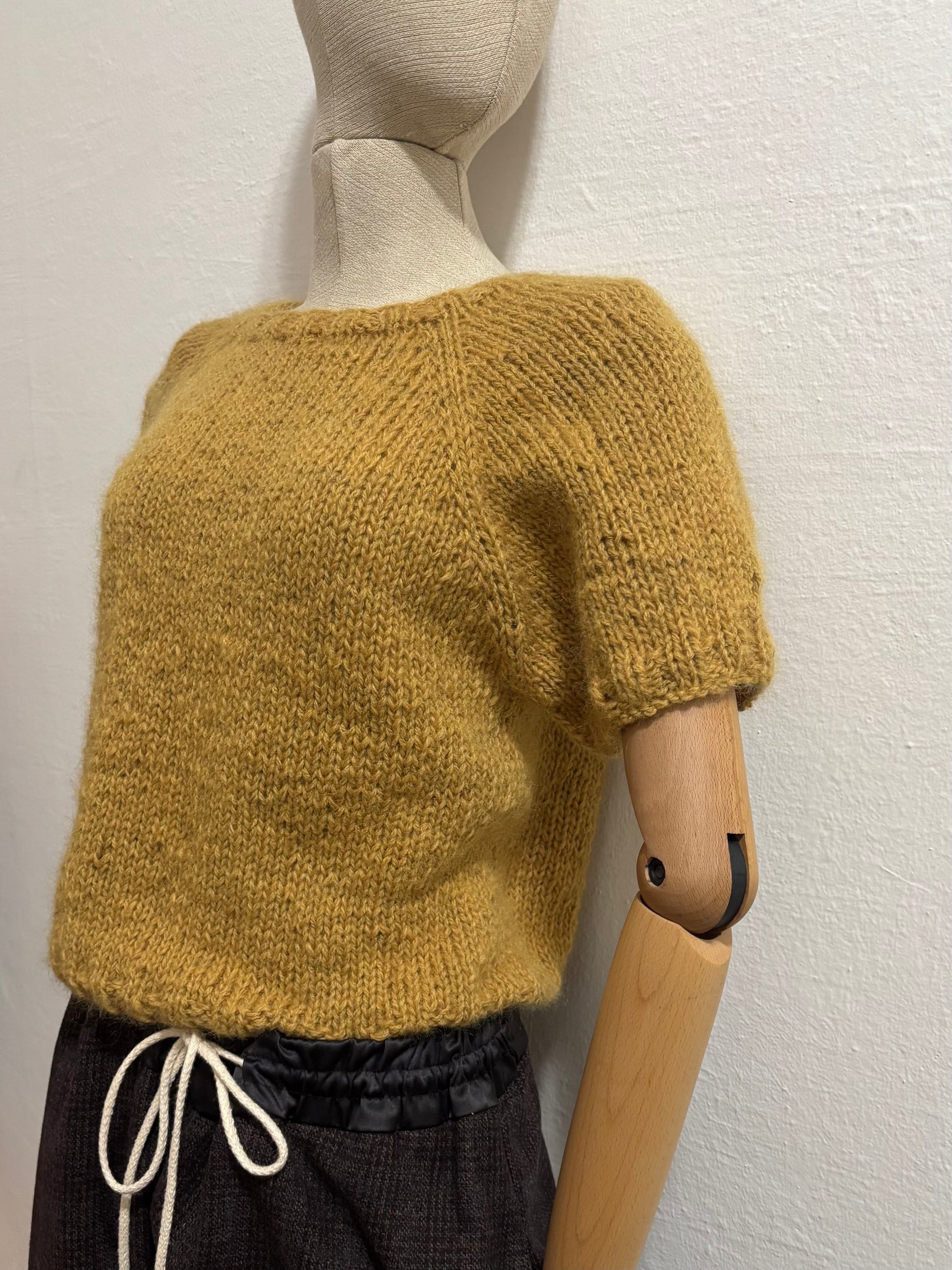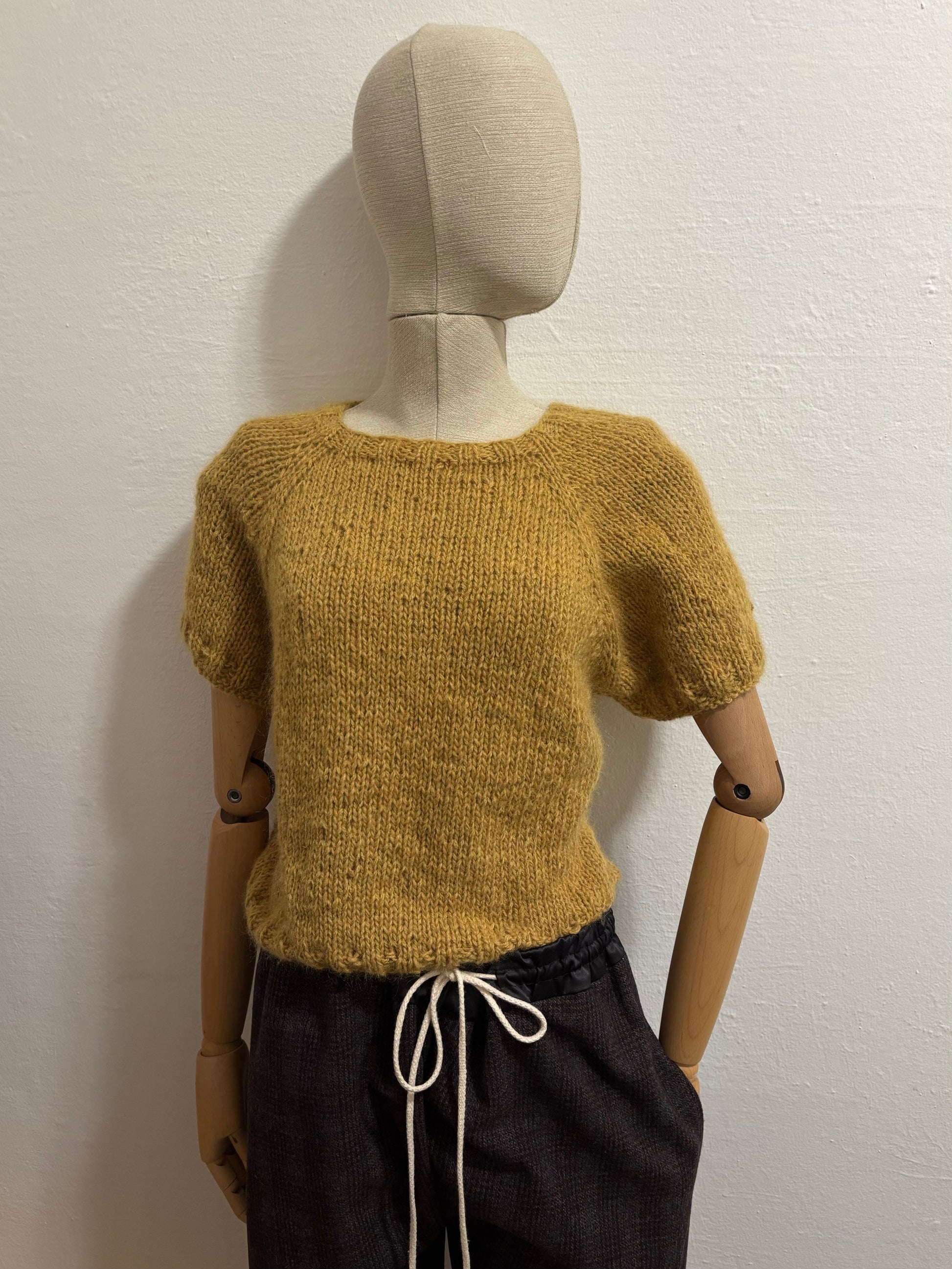 Maglia artigianale realizzata ai ferri unendo due filati pregiati di alpaca e lana, con una piccola percentuale di poliammide per stabilizzare la fibra e accompagnare il tempo.