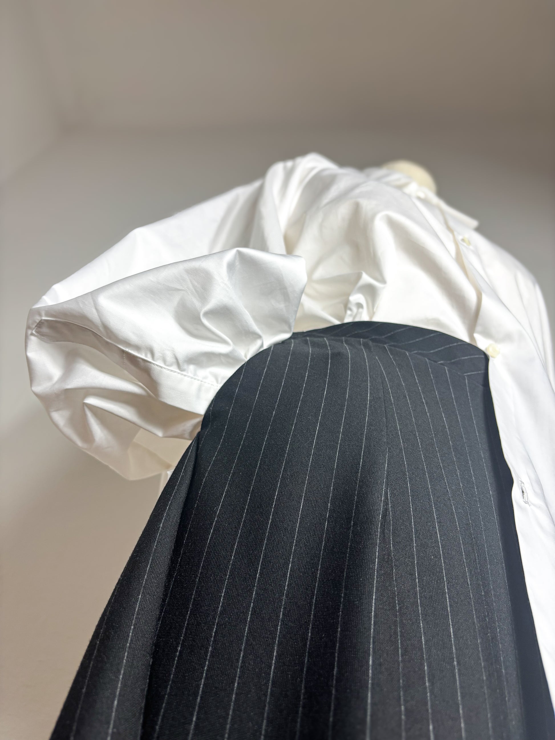Il davanti resta asciutto, composto; il dietro si fa più morbido, grazie all’elastico delicato che che raccoglie la vita e dona comfort e movimento.